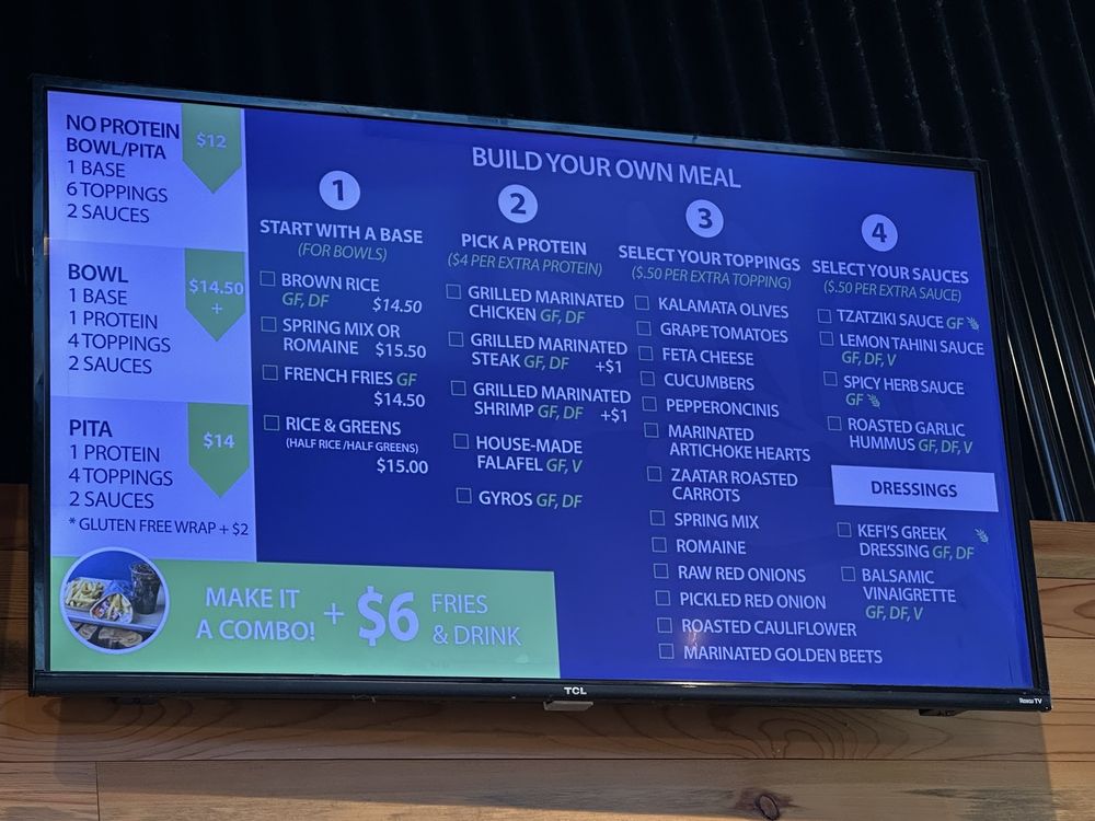 One of the highlights of Kefi is the build-your-own concept, where you can customize your meal to your liking. Choose from a selection of bases, proteins, and toppings to create a dish that suits your preferences. Whether you're in the mood for grilled marinated chicken, gyros, or falafel, Kefi has you covered.